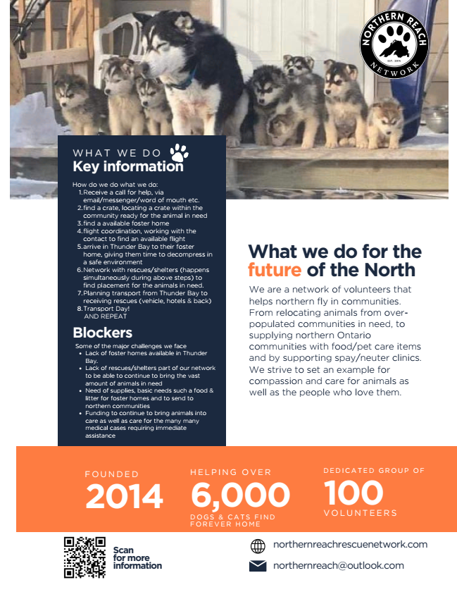 We are a network of volunteers that helps northern fly in communities. From relocating animals from overpopulated communities in need, to supplying northern Ontario communities with food/pet care items and by supporting spay/neuter clinics. We strive to set an example for compassion and care for animals as well as the people who love them. The gift cards and money will help us get food, and get much needed supplies to and from the communities.